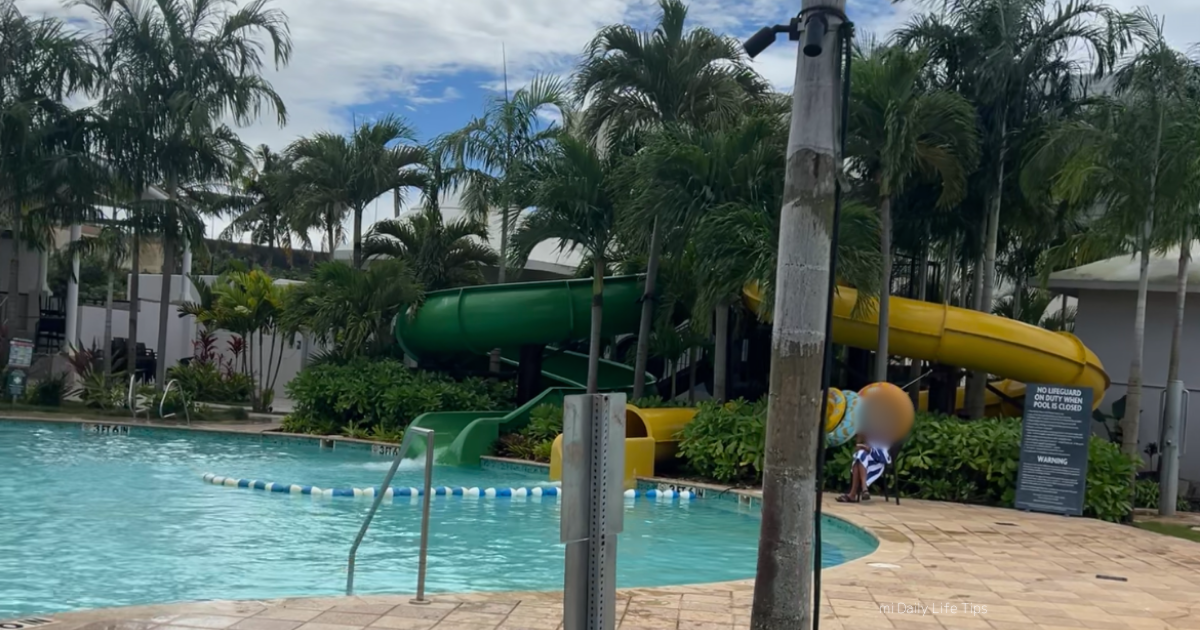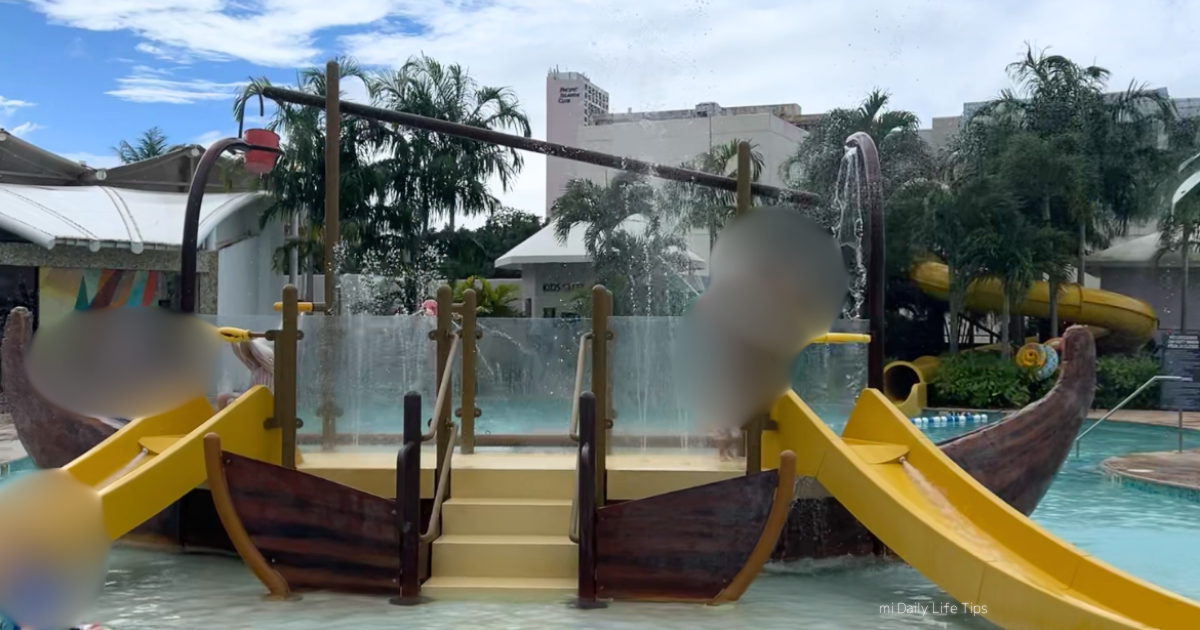 小さい子供でも楽しめる子供用の滑り台と子供から大人まで楽しめるスライダーがあり、周りはプールになっていて泳ぐことができます。