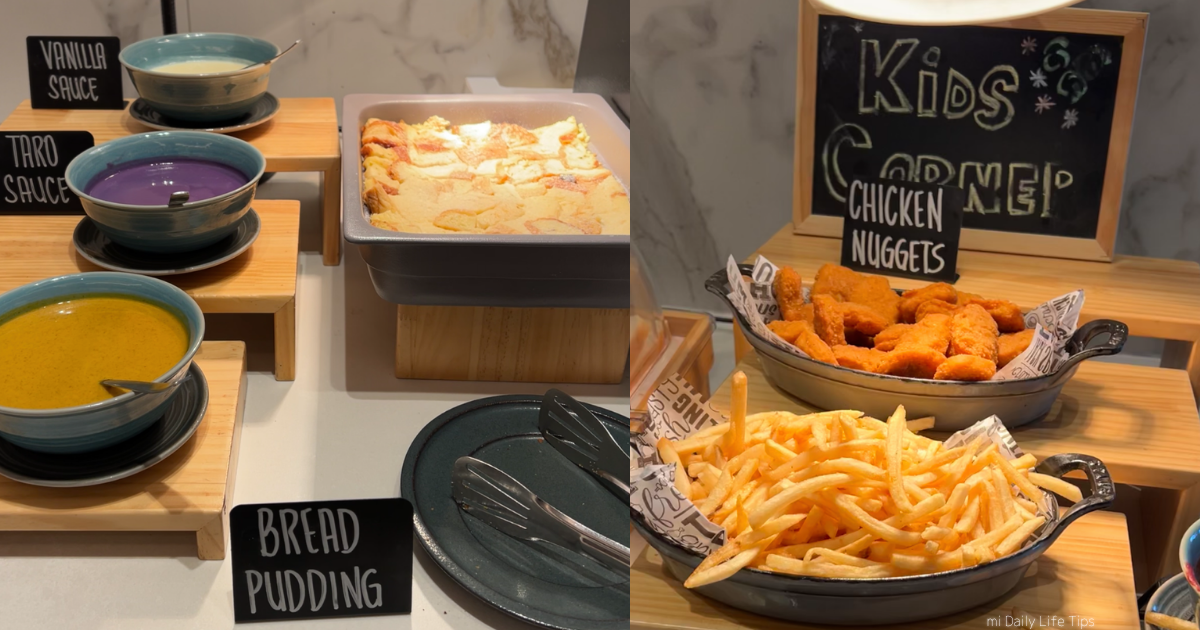 キッズコーナーには動物のプレートがあり、ポテトやチキンナゲット、バナナプディングなどが用意されていました。