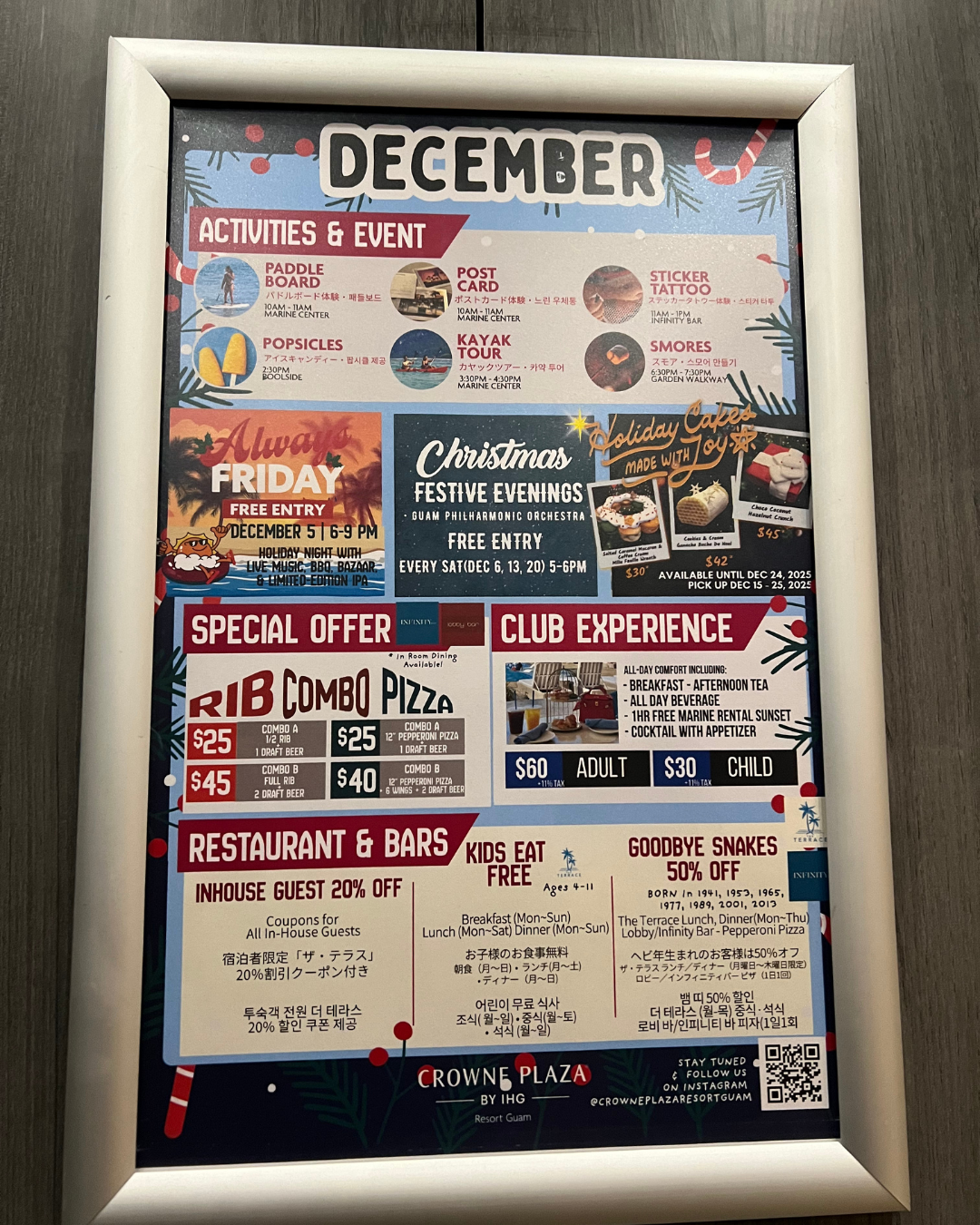 12月のプロモーションにはKIDS EAT FREEという子供の食事が無料になるイベントや、蛇年生まれの方のレストラン利用が50%オフで受けられたりと様々なイベントが開催されていました。