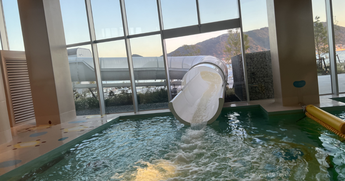 深さの異なるプールがいくつもあり、キッズ用の遊び場、休憩できるスペース、また、インフィニティプールまで備えられており、子供も大人も楽しめる屋内プールでした。