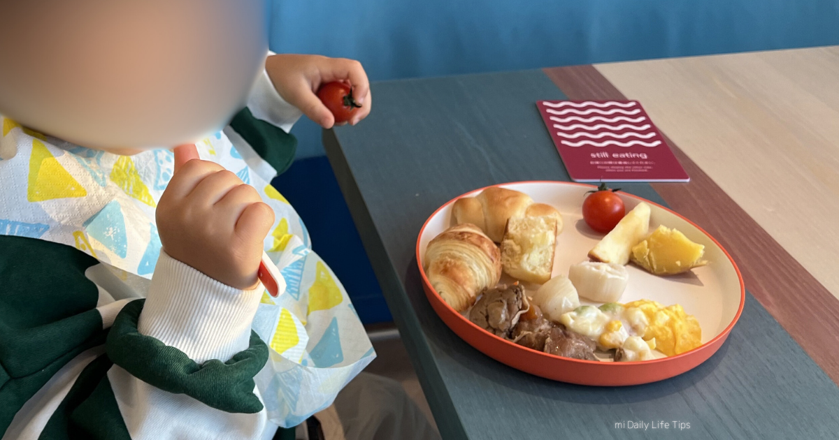 我が家の2歳児の朝食プレートはこんな感じ(下の写真)でした!絶賛食べムラ中だったので、ビュッフェスタイルはとても良かったです。