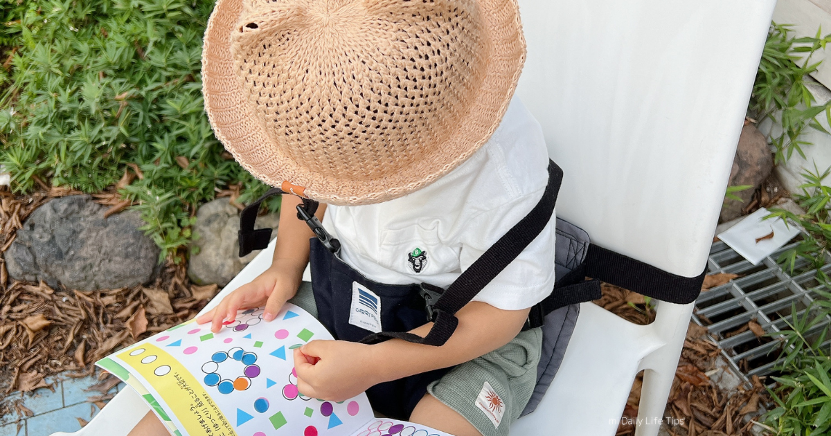 子ども椅子はなかったので、愛用中のチェアベルトで即席子ども椅子に。