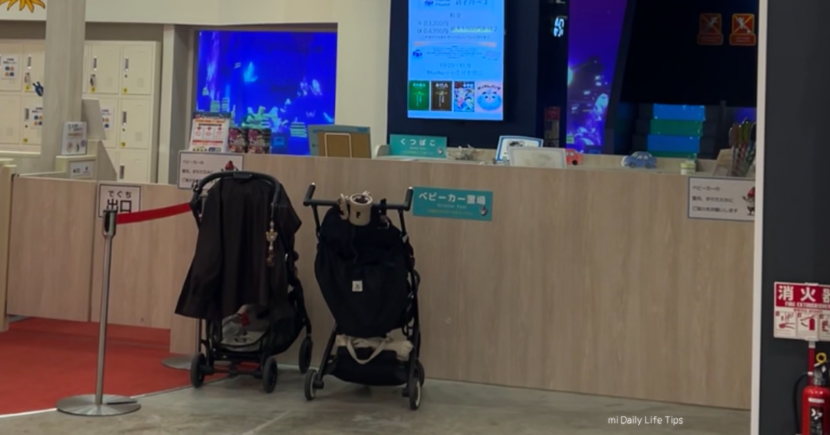 ベビーカー置き場あり。施設内にロッカーがあるので、必要な荷物などを持って受付へ。