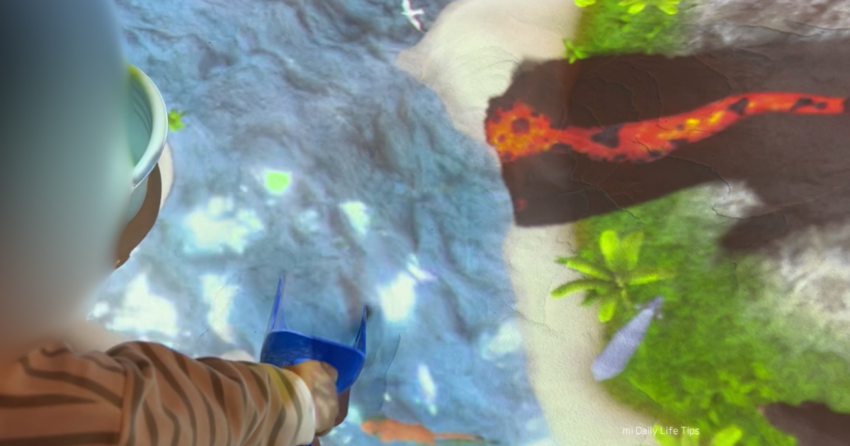 砂に映像が映し出されていて、砂をスコップで掘ったりバケツにいれたりして山や海など地