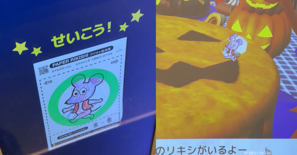 専用のぬりえ用紙に自分で色を塗り、機械でスキャンするとスクリーンに自分の塗ったキャ